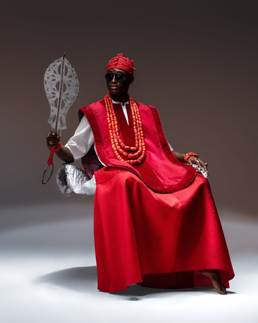 The first layer is a sleek armless pull-on made from luxurious suede, featuring a curved, rounded hem that adds fluid elegance. Over this sits a crisp white kaftan with a flowing silhouette that evokes the grandeur of Benin tradition. Completing the ensemble is a vibrant red damask skirt, its rich texture and bold hue conjuring the splendor of Edo royal heritage.