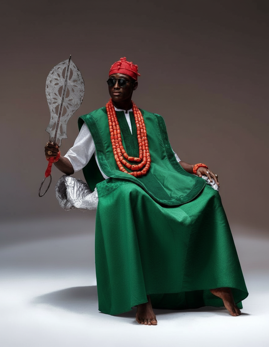 Inspired by the revered tradition of the Oba of Benin, this stunning 3-piece ensemble embodies the essence of Edo royalty. The striking combination of red and white hues, expertly crafted from damask, suede, and cashmere fabrics, creates a visual narrative of opulence and majesty.